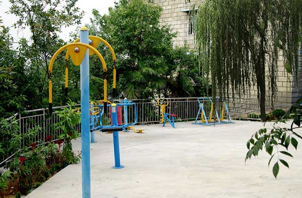 健身广场位于院内,是一个极具现代感、功能齐全的锻炼场所。广场上设有众多健身器材,如腹肌板、仰卧起坐器、太极拳架等;还有几个篮球场和乒乓球台,老人们可以进行各种不同形式的运动。